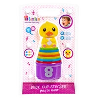 Zestaw kreatywnych kubeczków Bam Bam od 18 m-ca życia. Sześć różnokolorowych kubeczków, oznaczonych cyferkami od 1-8 umożliwia dzieciom łączenie ich na wiele sposobów. W tym na budowanie barwnej wieży zakończonej kuczkiem z figurką radosnej kaczuszki. Doskonale sprawdzają się także jako zabawka do kąpieli, umożliwiając przelewanie wody. Dzięki zabawie kubeczkami maluch uczy się rozpoznawania kształtów, kolorów, posługiwania się przedmiotami i dopasowywania ich od siebie, a także kreatywnego i logicznego myślenia. Rozwija koordynację ruchową oraz zdolności manualne, rozwija wyobraźnię.