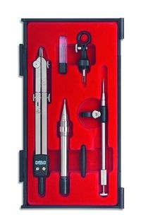 Zestaw zawiera: profesjonalny cyrkiel teleskopowy z łamanymi ramionami, cyrkiel zerownik z ruchomym szpicem i zintegrowanym uchwytem na zewnętrzny ołówek. W komplecie znajduje się także specjalny ołówek automatyczny, uchwyt do radiografu oraz zapasowy grafit. Komplet zapakowany jest w estetyczną i trwałą kasetkę.