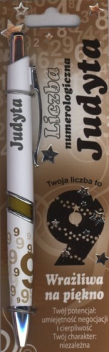 Długopis imienno-numerologiczny. Imię z przyporządkowaną "szczęśliwą liczbą". Na opakowaniu spisane główne cechy charakterystyczne dla danego imienia jak i główne cechy wyróżniające daną liczbę. Z tyłu kartonika diagram do wyliczenia Twojej liczby. Długopisy w różnych kolorach; kolory podporządkowane liczbom.