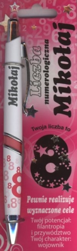 Długopis imienno-numerologiczny. Imię z przyporządkowaną "szczęśliwą liczbą". Na opakowaniu spisane główne cechy charakterystyczne dla danego imienia jak i główne cechy wyróżniające daną liczbę. Z tyłu kartonika diagram do wyliczenia Twojej liczby. Długopisy w różnych kolorach; kolory podporządkowane liczbom.