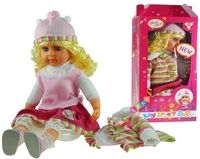 Lalka jest ubrana w kolorowe ubranko. Kubraczek,spódniczke,buciki, skarpety i czapeczke można ściągnąć. Lalka ma piękne kręcone i długie włosy-możesz czesać ją w różne ciekawe fryzury. Lalka jest na baterie. Spiewa wesołą piosenkę.