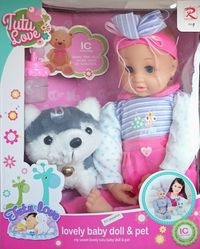 Interaktywna lalka bobas w zestawie z pluszowym pieskiem i akcesoriami. Lalka mówi i płacze. Dla dzieci w wieku od 3 lat.