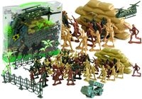 Mnogość elementów pozwala na fantastyczną zabawę, w której udział może brać kilka osób. W zestawie znajdują się żołnierzyki w trzech kolorach ? zielonym, beżowym i brązowym. Figurki te zaprojektowano i wykonano w wojennych, stonowanych barwach, co w dużym stopniu ułatwia kamuflaż i pozwala na ukrycie się przed wrogiem. W zestawie znajdują się również elementy infrastruktury, które pomogą zaaranżować pole wojenne ? co ciekawe, wrak samolotu wojskowego posiada dwa, obrotowe śmigła. Wojskowa ciężarówka, jak i sterta wielkich worków pozwolą na bezpieczne ukrycie się, a także atakowanie wroga. Z tak dobrze wyposażonym zestawem każdy chłopiec będzie pochłonięty zabawą przez długie godziny. Waga wszystkich figurek jest bardzo lekka, natomiast wymiary zabawek dostosowane są do rączek kilkuletnich dzieci, dzięki czemu zabawa z ich wykorzystaniem jest bardzo komfortowa i prosta.