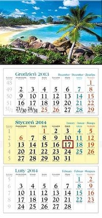 Kalendarium: trzy oddzielne bloczki (31 x 15 cm), doklejone do pleców, miesiąc bieżący wyróżniony kolorystycznie, podwójne imiona, bieżąca numeracja tygodni