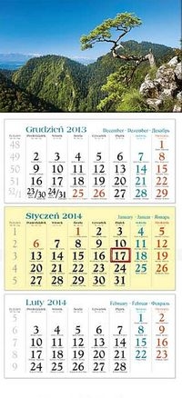 Kalendarium: trzy oddzielne bloczki (31 x 15 cm), doklejone do pleców, miesiąc bieżący wyróżniony kolorystycznie, podwójne imiona, bieżąca numeracja tygodni