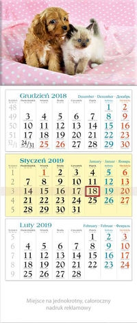 Posiadają trzy oddzielne kalendaria: miesiąc poprzedni, miesiąc bieżący (wyróżniony tłem) oraz miesiąc następny, naklejone na wspólnej tekturce (tzw. ?plecki?) z miejscem pod nadruk reklamowy. Kalendarium jest duże i czytelne, tak aby było widoczne z daleka, bez konieczności podchodzenia. W komplecie znajduje się również plastikowy pasek z czerwonym okienkiem, dla wydzielenia dnia bieżącego. Kalendarze trójdzielne zaopatrzone są w ?główkę?, czyli zdjęcie, naklejone na specjalną tekturę, która daje efekt wypukłości. Tematyka fotografii obejmuje pejzaże, kwiaty, dzieci, motoryzację, zwierzęta, malarstwo itp.