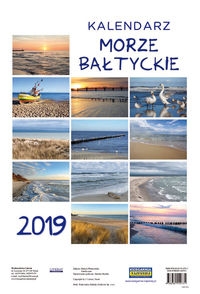 Kalendarz ścienny na 2019 rok z pejzażami morskimi. Format: 32 x 48 cm, papier kredowy, druk jednostronny, barwny. Na każdej stronie zdjęcie, miesiąc bieżący z zaznaczonymi imieninami, świętami i numeracją tygodni oraz miniatury miesięcy poprzedniego i następnego.