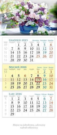 Kalendarze trójdzielne opracowane zostały głównie dla potrzeb biurowych. Posiadają trzy oddzielne kalendaria: miesiąc poprzedni, miesiąc bieżący (wyróżniony tłem) oraz miesiąc następny, naklejone na wspólnej tekturce (tzw. ?plecki?) z miejscem pod nadruk reklamowy. Kalendarium jest duże i czytelne, tak aby było widoczne z daleka, bez konieczności podchodzenia. W komplecie znajduje się również plastikowy pasek z czerwonym okienkiem, dla wydzielenia dnia bieżącego. Kalendarze trójdzielne zaopatrzone są w ?główkę?, czyli zdjęcie, naklejone na specjalną tekturę, która daje efekt wypukłości. Tematyka fotografii obejmuje pejzaże, kwiaty, dzieci, motoryzację, zwierzęta, malarstwo itp.
