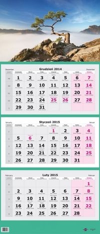 Kalendarz trójdzielny na rok 2015, kartonowe plecy, opaska do zaznaczania daty. Wymiary po rozłożeniu: 31 x 79 cm.