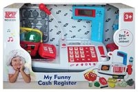 Kasa sklepowa z otwieraną szufladą i cyfrowym wyświetlaczem. W komplecie towary i monety. Dla dzieci w wieku od 3 lat.
