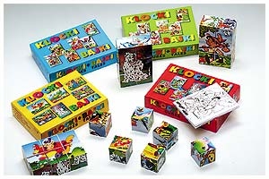 6 klocków, ściany z polistyrenu, do ułożenia 6 obrazków, różne wzory.