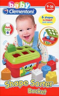 6 kolorowych klocków w kształcie walca, trójkąta, kwadratu, kwiatka, gwiazdki i serca, do wkładania w odpowiednie otwory w pokrywce koszyka. 9-36m