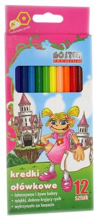 Kredki ołówkowe. Wysokiej jakości drewno i miękki grafit. Komplet 12 intensywnych kolorów. Hexagonalny kształt. Temperowane.