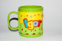 Plastikowy kubek imienny dla dziecka, na zewnątrz pokryty antypoślizgową gumą. Posiada wygodny duży uchwyt do trzymania. Idealny do domu, przedszkola lub na wyjazdy.