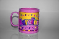 Plastikowy kubek imienny dla dziecka, na zewnątrz pokryty antypoślizgową gumą. Posiada wygodny duży uchwyt do trzymania. Idealny do domu, przedszkola lub na wyjazdy.
