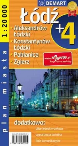 Mapa aglomeracji łódzkiej obejmująca Łódź, Aleksandrów Łódzki, Konstantynów Łódzki, Pabianice i Zgierz. Zawiera opis linii komunikacyjnych, sygnalizacji świetlnej i ulic jednokierunkowych.