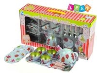 15-elementowy piękny zestaw do herbaty to znakomita propozycja dla małych dziewczynek lubiących zabawy w dom. Zabawka wykonana z metalu, lakierowana.