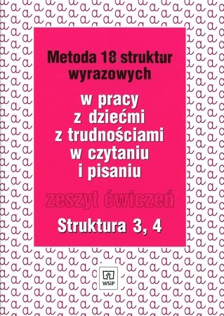 Publikacja polecana w programie pomocy psychologiczno-pedagogicznej WSiP na zajęcia dydaktyczno-wyrównawcze dla dzieci z trudnościami w czytaniu i pisaniu. Zeszyt ćwiczeń jest przeznaczony dla ucznia i służy praktycznemu usprawnianiu czytania i pisania. Zawiera napisane pismem odręcznym suwaki literowe i wprawki do poszczególnych części oryginalnej metody 18 struktur wyrazowych. Obejmuje wyrazy o określonej strukturze ? od najprostszych, dwusylabowych, do złożonych wyrazów wielosylabowych z grupami spółgłoskowymi w obrębie jednej sylaby. Suwaki literowe zawierają wyrazy, które mają pewną część wspólną (literę, ich zestaw lub sylabę) dla kilku słów. Z kolei we wprawkach zamieszczono zestawy wyrazów o określonej budowie, ułożone w ten sposób, aby przy czytaniu zachowywały rytm i rym. Zeszyt umożliwia samodzielną pracę ucznia (pod kontrolą osoby prowadzącej zajęcia) i stanowi podstawę posługiwania się metodą 18 struktur wyrazowych. Służy do ćwiczeń analizy sylabowej wyrazów, do ćwiczeń pisania według wzoru z głośnym wypowiadaniem sylab oraz do ćwiczeń poprawności i płynności czytania.