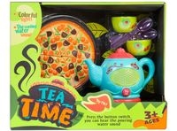 Czajnik znajdujący się w zestawie po naciśnięciu czerwonego guziczka wydaje odgłosy gotującej się wody oraz świeci się różnymi kolorami. Zestaw zawiera: czajnik, 2x filiżanki, 2x łyżeczki, 6 kawałków pizzy. Produkt wykonany z plastiku. Przeznaczony dla dzieci od lat 3.