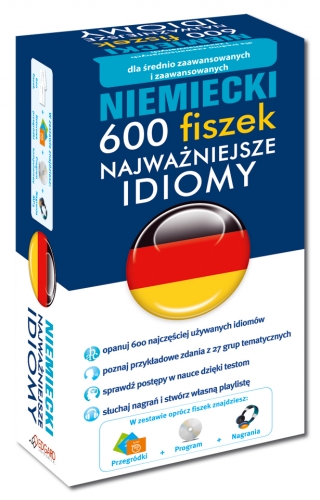 Niemiecki 600 fiszek NAJWAŻNIEJSZE IDIOMY to wyjątkowy zestaw ponumerowanych kartoników do nauki języka niemieckiego. Nauka z kursem pozwala szybko i skutecznie opanować idiomy najczęściej używane w języku niemieckim. Przykłady użycia idiomów w zdaniach to gotowe wzorce komunikacyjne. Aby ułatwić zapamiętanie materiału metodą skojarzeń, kurs podzielono na 27 praktycznych grup tematycznych. Kolorowe przegródki pozwalają zaplanować naukę, a nagrania mp3 ułatwiają opanowanie prawidłowej wymowy. Do zestawu dołączony jest także program FISZKI MP3 z testami oraz funkcją umożliwiającą tworzenie osobistej playlisty, której możesz słuchać, gdzie i kiedy tylko chcesz!