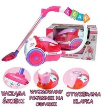 Odkurzacz działa jak prawdziwa maszyna! Po włączeniu świeci i wciąga styropianowe kulki (śmieci), które również dołączono do zestawu. Po zakończonej zabawie kuleczki mogą zostać w odkurzaczu lub można użyć je do ponownej zabawy! Odkurzacz wypsażony jest w otwierana klapę wraz z umieszczonym wewnątrz wyjmowanym pojemnikiem na odpadki.
