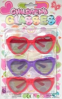 Zestaw 3 sztuk plastikowych okularków przeciwsłonecznych dla dzieci. Kolory mogą się różnić od przedstawionych na zdjęciu. Zabawka dla dzieci w wieku od 3 lat.