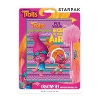 Pamiętnik z kolekcji Starpak zamykany na kłódkę aby lepiej chronić małe sekrety. Okładka przedstawia grafikę Trolls. Do zestawu dołączono długopis z ozdobnym wykończeniem z piór. Pamiętnik rozwija wyobraźnię oraz wpływa na rozwój umiejętności dziecka w zakresie formułowania myśli i zmiany ich w formę pisemną. Zapoznaj się również z innymi produktami Starpak z serii Trolls! Zestaw pakowany na blistrze. Przeznaczony dla dzieci w wieku: 3+. Wymiary opakowania(wys.x szer. x gł.) [cm]: 24,5x18,5x2.