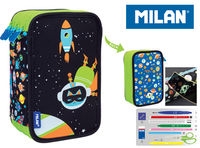 Piórnik MILAN 3-poziomowy z wyposażeniem z kolekcji SUPER HEROES SPACE. NOWOŚĆ: Elementy fluorescencyjne świecące w ciemności. Wyposażenie: 12 kredek trójkątnych, 10 kredek PLASTIPASTEL, 18 flamastrów ze stożkową końcówką, 3 długopisy CAPSULA UNO, ołówek HB, 5 zakreślaczy FLUO junior, nożyczki, temperówka AFILA, 2 gumki syntetyczne, linijka trójkątna.