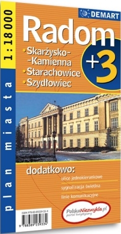 Plan Radomia w skali 1:18 000 (centrum w skali 1:9 000), wzbogacony o plany najważniejszych miast w okolicy: Skarżyska-Kamiennej, Starachowic, Szydłowca.