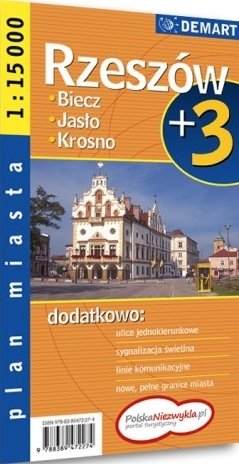 Plan Rzeszowa w skali 1:15 000 plus centrum w skali 1:7 500, wzbogacony o plany najważniejszych miast w okolicy: jasła, Biecza i Krosna.