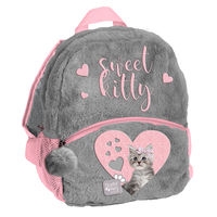 Plecak wykonany z wysokiej jakości pluszu, dno wykonane z poliestru, jedna obszerna komora, jedna przednia kieszeń, dwie boczne kieszonki z siatki, dekoracje naszywka PVC, haft, podszewka, zadrukowane,usztywniane szelki, dodatkowo pluszowy pomponik przy jednym zamku, przy drugim wstążeczka.
