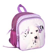 Mały plecaczek z motywem pieska, jednokomorowy, jedna kieszeń na zamek na froncie, boczne kieszenie z siatki, pasy nośne.