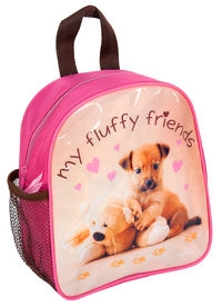 Mały plecak, jedna komora, z jednej strony kieszeń z siatki, pasy nośne.