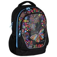 Plecak szkolny. Posiada dwie komory główne, jedną kieszeń z przodu, boczne kieszenie z siatki, sztywne, ergonomiczne plecy pokryte siatką, profilowane szelki, sztywne dno, elementy odblaskowe.