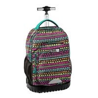 Plecak na kółkach. Dwie pojemne komory, przednia kieszeń z organizerem, dwie boczne kieszonki z siatki. Chowany stelaż z dwustopniową regulacją. Profilowane, wyściełane gąbką szelki, wygodny uchwyt do przenoszenia. Wzmocnione dno, chowana osłonka na kółka.