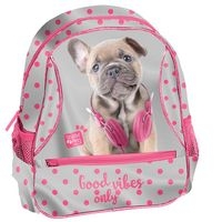 Plecak przedszkolny. Jedna główna komora, jedna kieszeń na froncie, dwie boczne kieszenie z siatki - mieszczą małą butelkę, bidon lub termos. Wygodny uchwyt do przenoszenia. Regulowane szelki z materiału. Ozdobne wstążki przy pullerach ułatwiające rozpinanie.