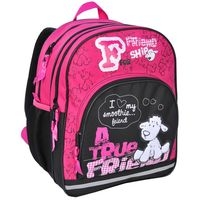 Plecak szkolny: dwie duże komory zapinane na zamek, jedna kieszeń na froncie na zamek, dwie kieszenie boczne z siatki, plecy usztywniane, pokryte siatką, pullery i uchwyty gumowe, szerokie regulowane pasy nośne.