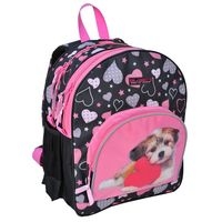 Plecak szkolny: dwie duże komory zapinane na zamek, jedna kieszeń na froncie na zamek, dwie kieszenie boczne z siatki, plecy usztywniane, pokryte siatką, pullery i uchwyty gumowe, szerokie regulowane pasy nośne.