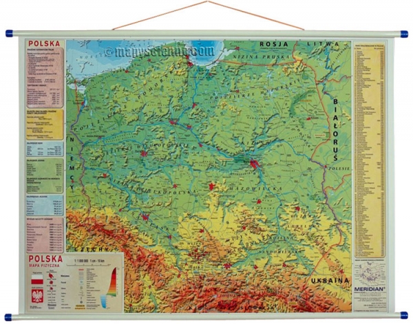 Ścienna mapa gabinetowa przedstawiająca ukształtowanie powierzchni Polski. Mapę fizyczną Polski wzbogacono dodatkowo o informacje na temat ochrony środowiska. Umieszczone są na niej parki narodowe, parki krajobrazowe, ostoje wodno - błotne objęte konwencją Ramsarską oraz rezerwaty biosfery wpisane na światową listę UNESCO. Mapa wykonana jest najnowocześniejszą techniką pozwalającą na uzyskanie unikalnego efektu trójwymiarowego. Po obu stronach mapy rozmieszczone są uzupełniające informacje i opisy oraz mapka obszarów zagrożenia ekologicznego.