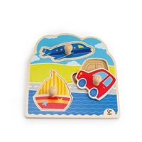 Kolorowe, wykonane z ekologicznego drewna puzzle pomagają dzieciom poznawać pojazdy i ich kształty poprzez dopasowywanie.