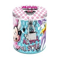Skarbonka w okrągłym kształcie z lakierowanego metalu, zamykana na kłódkę. Zdobiona wizerunkiem Minnie.