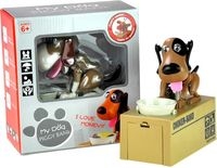 Piesek zjada pieniążki leżące w jego misce przy czym wydaje dźwięki oraz się porusza.
