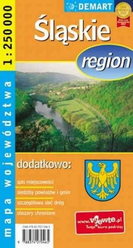 Mapa województwa Śląskiego w skali 1:250 000, wzbogacona o pełny wykaz danych teleadresowych urzędów administracji państwowej (urzędy marszałkowskie, urzędy wojewódzkie, siedziby powiatów i gmin).