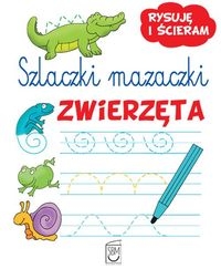 Szlaczki mazaczki. Zwierzęta to kolorowa książeczka, dzięki której dzieci będą mogły nauczyć się trudnej sztuki rysowania szlaczków. Znajdujące się w książce barwne ilustracje z pewnością umilą zabawę! W książeczce pisz specjalnym, ścieralnym mazakiem. Dzięki temu będziesz mógł wielokrotnie ją wykorzystać. Kiedy się pomylisz albo będziesz chciał wykonać ćwiczenie jeszcze raz, zetrzyj szlaczek chusteczką lub gąbką. Książeczka przeznaczona dla dzieci w wieku 3-6 lat
