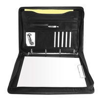 Teczka konferencyjna A4: -materiał: skóra ekologiczna -łatwa w czyszczeniu Wnętrze: -4-ringowy segregator -klips -kieszeń na dokumenty -miejsce na długopis -kieszenie na wizytówki -kieszeń z przezroczystą folią