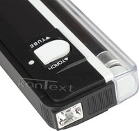 Lampa UV pozwala testować prawdziwość banknotów, wykrywać zanieczyszczenia niezauważalne na pierwszy rzut oka itp. Baterie wystarczają do 8 godzin nieprzerwanej pracy na pełnej mocy. Zasilanie: 4 baterie AA. Wymiary: 15x5x8,5cm.