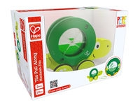 Mały zielony żółwik ma na grzbiecie okrągły pojemniczek który wiruje gdy zabawka jest ciągnięcia przez dziecko. W środku przelewa się intrygująco zielony płyn. Pojemniczek można zdjąć z grzbietu żółwika i wykorzystać jako osobną zabawkę.