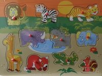 Drewniane puzzle z uchwytami - dzikie zwierzęta. Elementy można wyjąć z układanki i ponownie dopasować w odpowiednie otwory w drewnianej ramce.