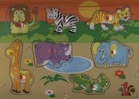 Drewniane puzzle z uchwytami - dzikie zwierzęta. Elementy można wyjąć z układanki i ponownie dopasować w odpowiednie otwory w drewnianej ramce.