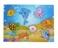 Drewniane puzzle z uchwytami - zwierzęta morskie. Elementy można wyjąć z układanki i ponownie dopasować w odpowiednie otwory w drewnianej ramce.